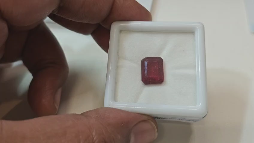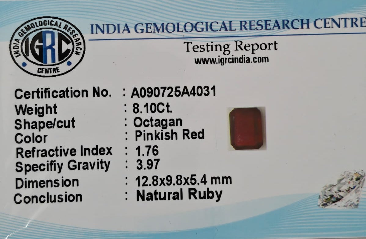 Natural Ruby 8.10ct - Octagon Cut Gemstone This exquisite natural ruby weighs 8.10 carats and features a striking octagon cut with a captivating pinkish-red hue.