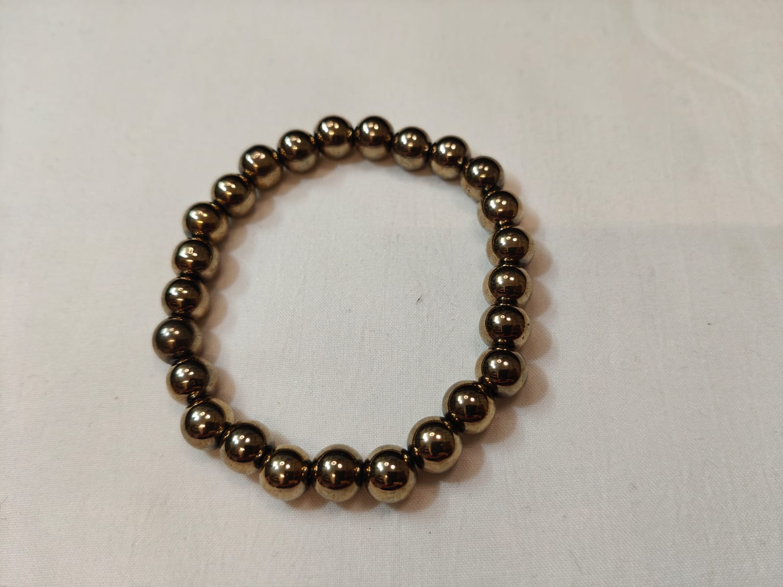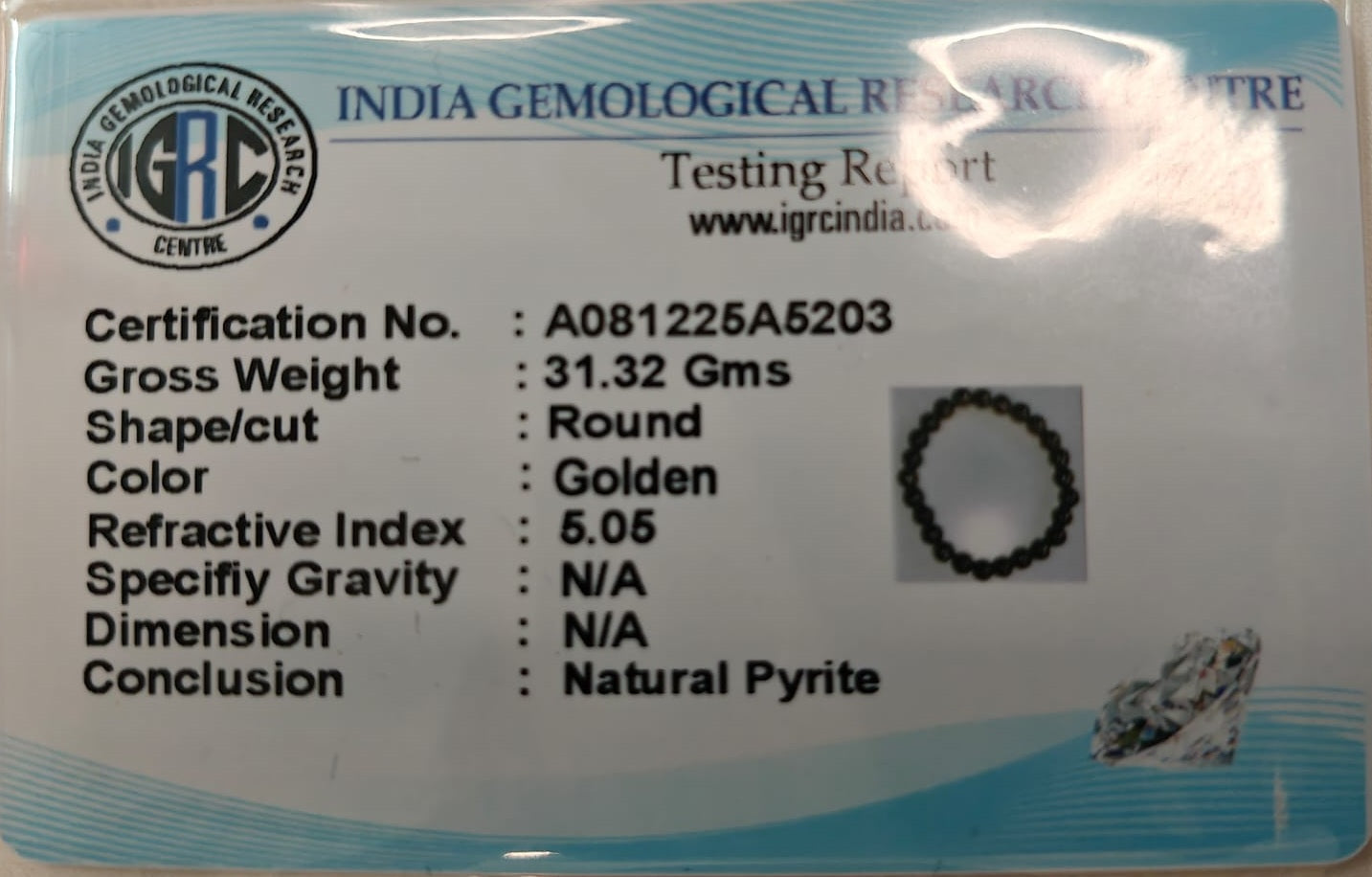 Harness the grounding energy of natural lab certified pyrite with this 31-gram bracelet, showcasing the mineral's distinctive golden luster. Pyrite, known as "fool's gold," has been valued for centuries for its believed ability to enhance confidence, attract prosperity, and promote mental clarity. This authentic piece combines aesthetic appeal with the metaphysical properties traditionally associated with pyrite, making it an ideal choice for those seeking both style and spiritual benefit. Perfect for daily wear or meditation practice.